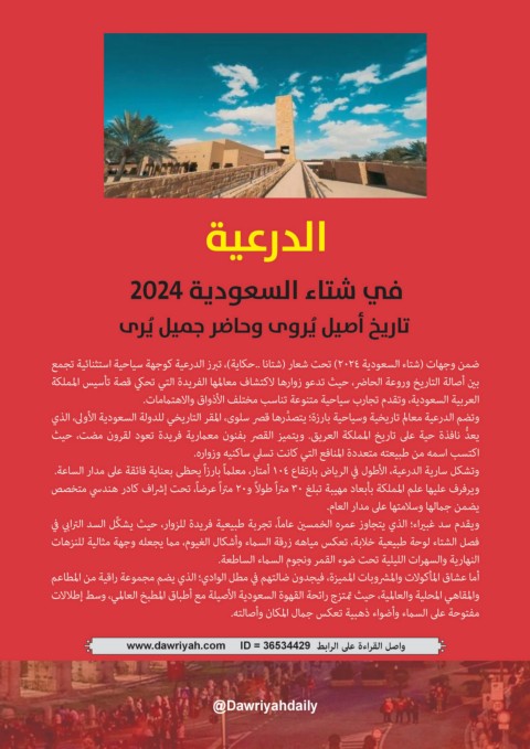 ضمن وجهات (شتاء السعودية )2024تحت شعار (شتانا ..حكاية) ،تبرز الدرعية كوجهة سياحية استثنائية تجمع