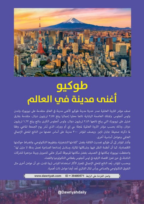 صنف مؤشر للثروة العالمية صدر حديثا مدينة طوكيو كأغنى مدينة في العالم ،متقدمة على نيويورك ولندن
