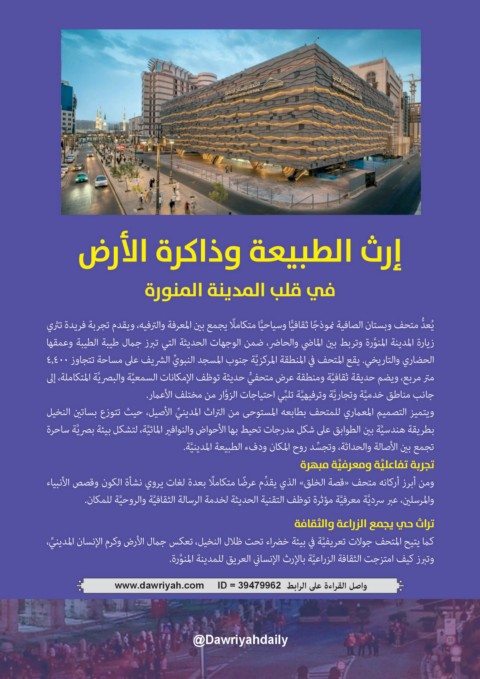 متر مربع ،ويضم حديقة ثقاف َيّة ومنطقة عرض متحف ٍّي حديثة توظف الإمكانات السمعيَّة والبصريَّة المتكاملة ،إلى