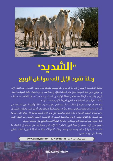 تحتفظ المجتمعات الرعوية في الجزيرة العربية برحلة موسمية متوارثة تُعرف باسم "الشديد" ،وهي انتقال الإبل